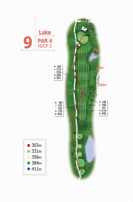 야자수와 작은 호수가 이국적인 분위기를 자아내는 비교적 긴 384m PAR 4 홀입니다. 그린 뒤쪽 쌍둥이 벙커를 보시고 치시면 좋습니다.